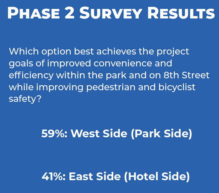 For Phase 1, initial surveys were developed to elicit community responses to park improvements, as well as improvements to 8th Street beginning April 30, 2025 with in person feedback opportunities at the Downtown Growers’ Market on May 3, 2025. DAMI also hosted a community meeting to provide updates and collect additional responses June 17, 2025 at FUSION.