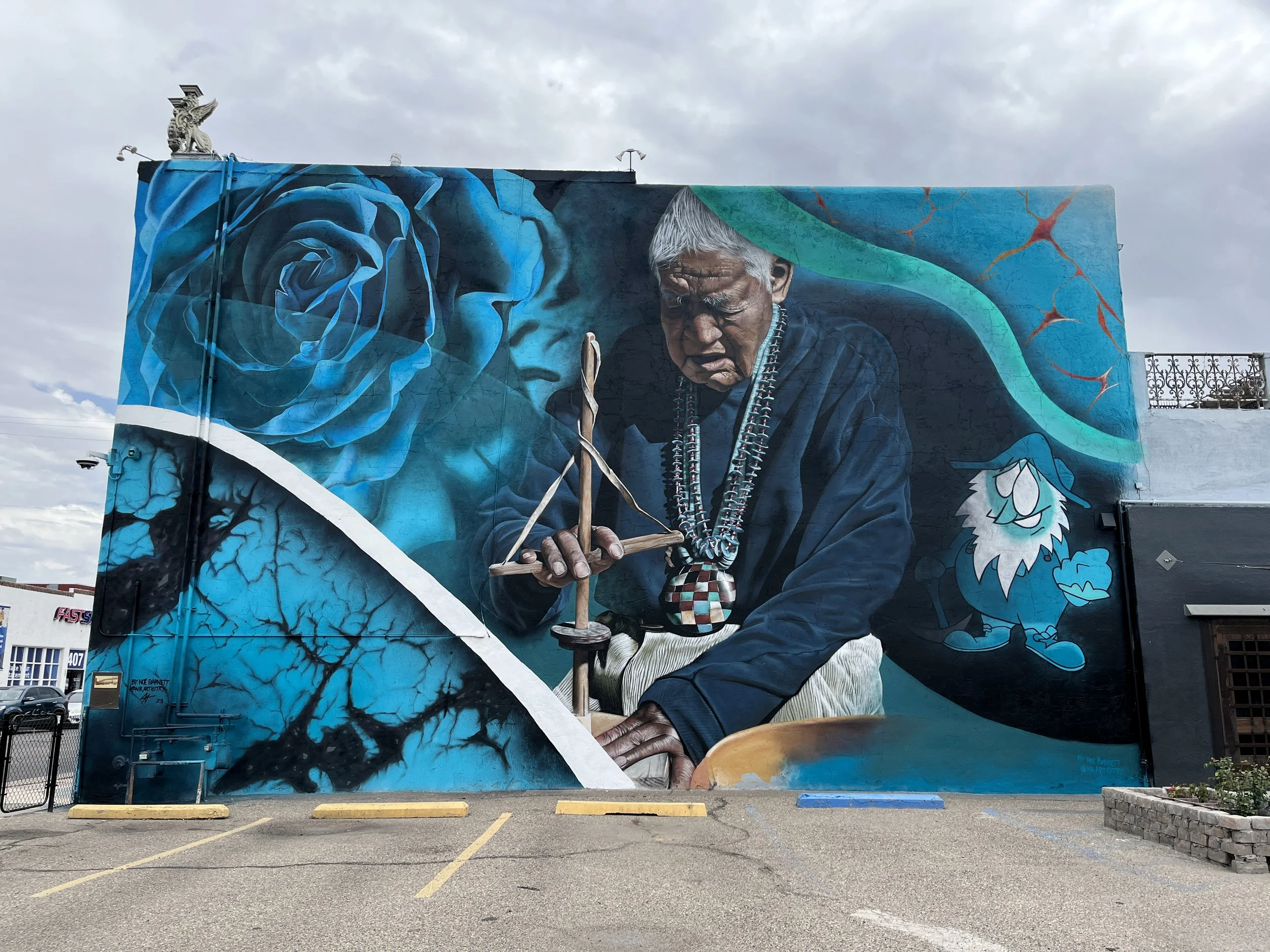 Noé Barnett, a muralist and painter, infuses the streets with life through his vibrant creations. A native of Albuquerque, NM, Barnett's roots have shaped his approach to art. His murals are dialogues in color and form, engaging communities and using light to invigorate public spaces with new narratives. View half a dozen of his murals in the Downtown area. Image shows his mural at the Turquoise Museum.