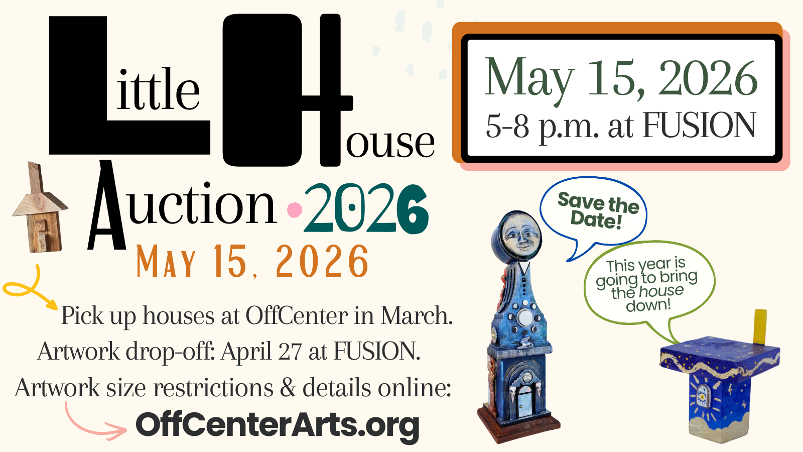 One of the most beloved events that OffCenter hosts is our annual Little House Auction! This is a fundraiser but it really serves as the most fun community exhibition, with 150-200 ‘little house’ artworks created by artists for us to auction. The auction is at FUSION on Friday, May 15, but we kick off the project with a look back at past houses as part of our Artwalk exhibition at OffCenter in March. March is also when folks can start to sign up as Little House artists and pick up the wood ‘blanks’ that most artists use to create their Little House.